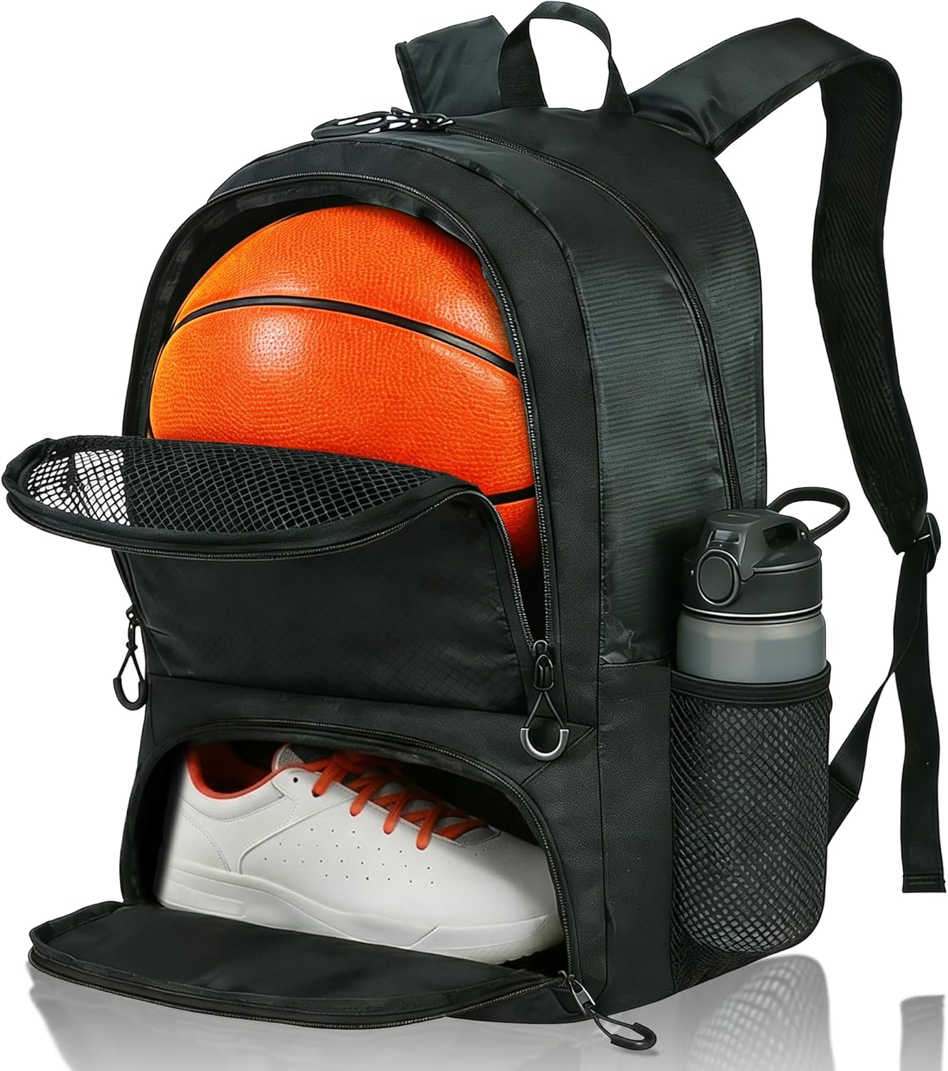Upgraded Storage Space: This basketball backpack features multiple soft storage compartments: 1 dedicated basketball compartment, 1 breathable shoe compartment, 1 main clothing compartment for clothes, towels, phones, wallets, keys, and other gear; and two side mesh pockets for water bottles. Helping all your belongings stay organized.